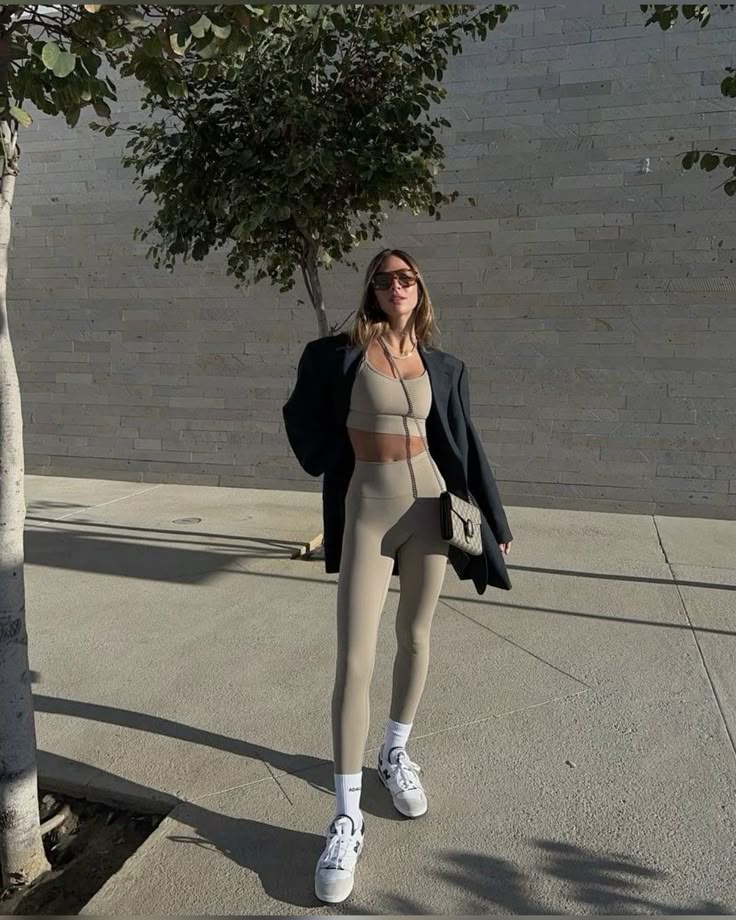 A stylish combo of leggings, sports bra, oversized sweatshirt/blazer, and sleek sneakers.