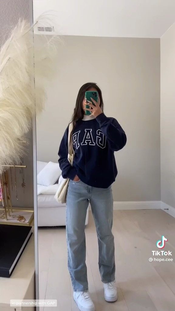 The ultimate laid-back airport uniform: a classic navy GAP sweatshirt that brings all the cozy vibes, paired with relaxed light-wash denim, it’s casual while still feeling put together.