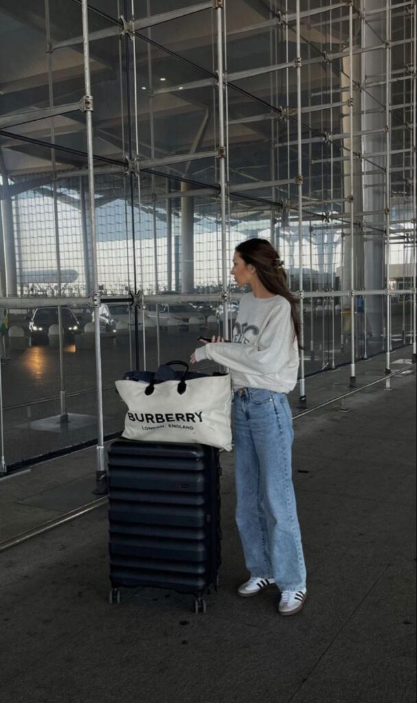 This chic Burberry tote bag—logo front and center, shouts luxury while holding all the travel essentials.