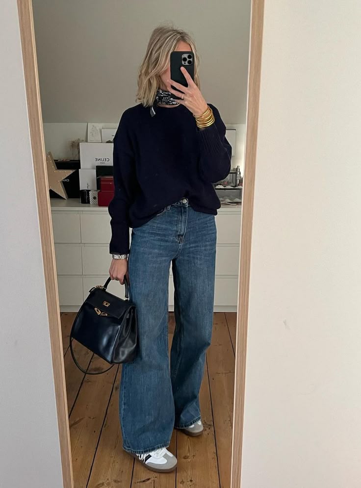 Paired with it are these high-waisted, wide-leg jeans in a classic blue wash—total travel win because they’re roomy for sitting long hours but still look cool.