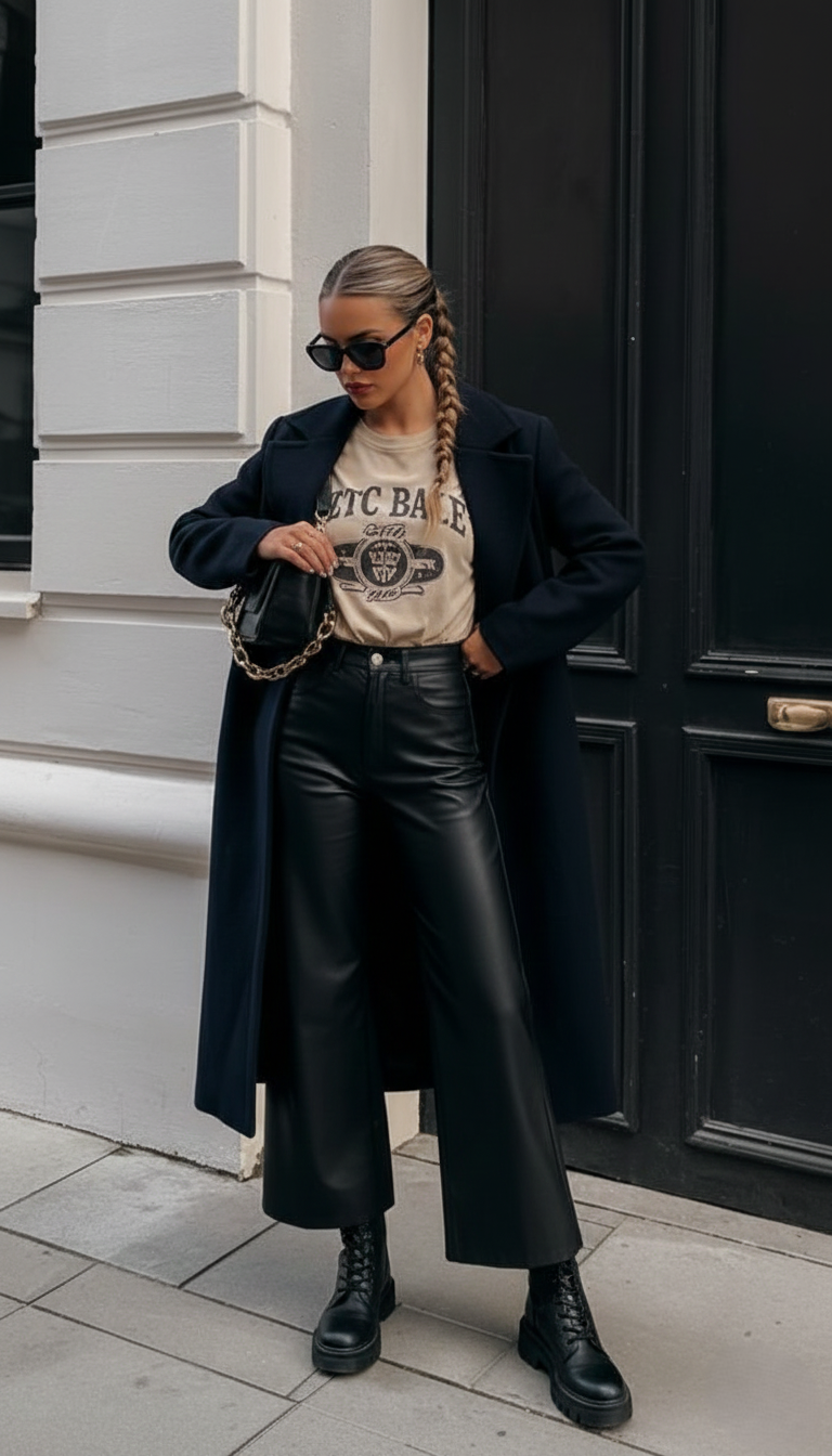 Navy coat + black leather pants + graphic tee + combat boots