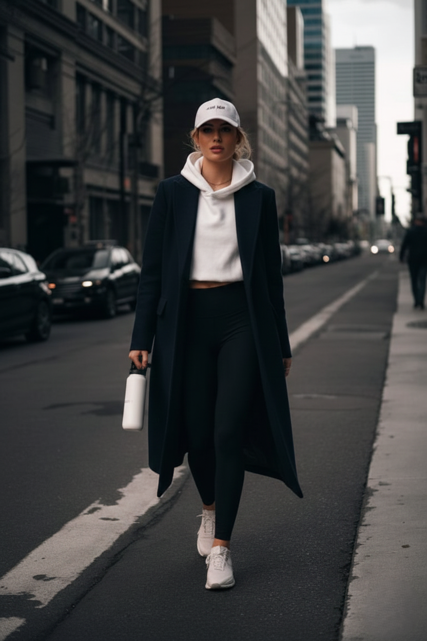 Navy coat + black leggings + white oversized hoodie + chunky white sneakers + baseball cap