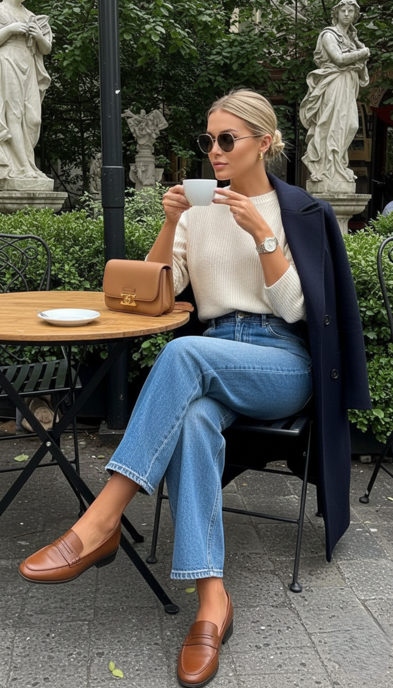 Navy coat + wide-leg jeans + Cream sweater + brown loafers + tan bag