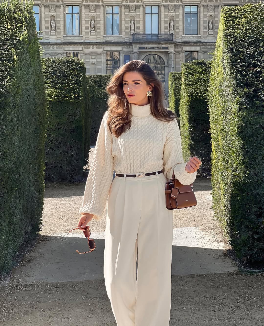 1. Cream cable-knit sweater + Cream tailored trouser + Brown hand bag