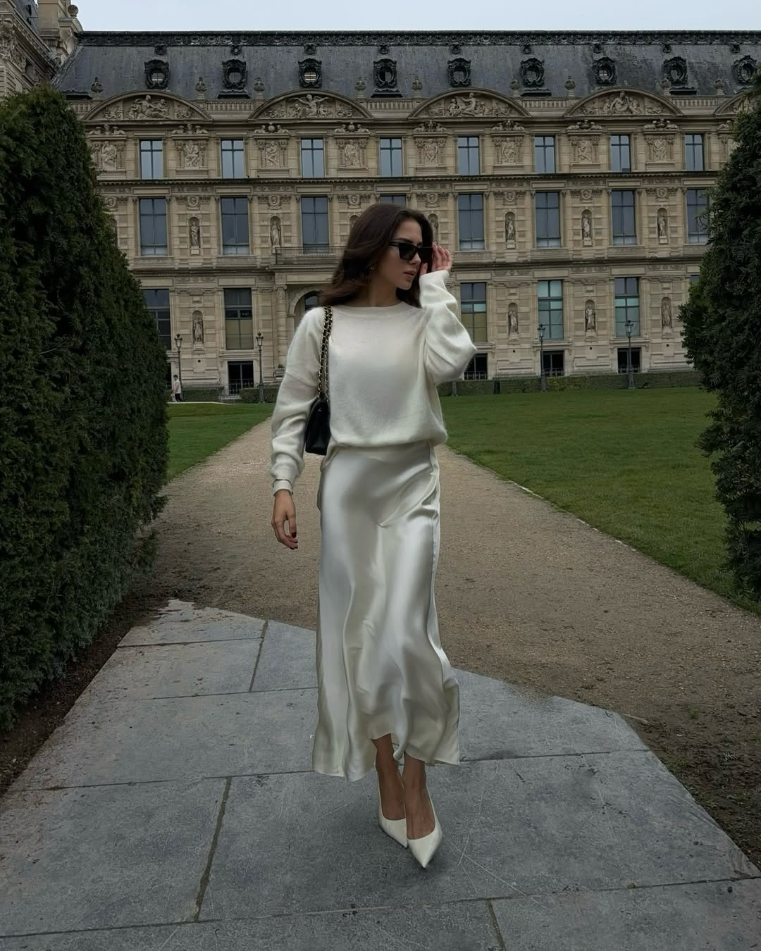 5. Cashmere sweater + midi skirt + Pointed-toe Heels