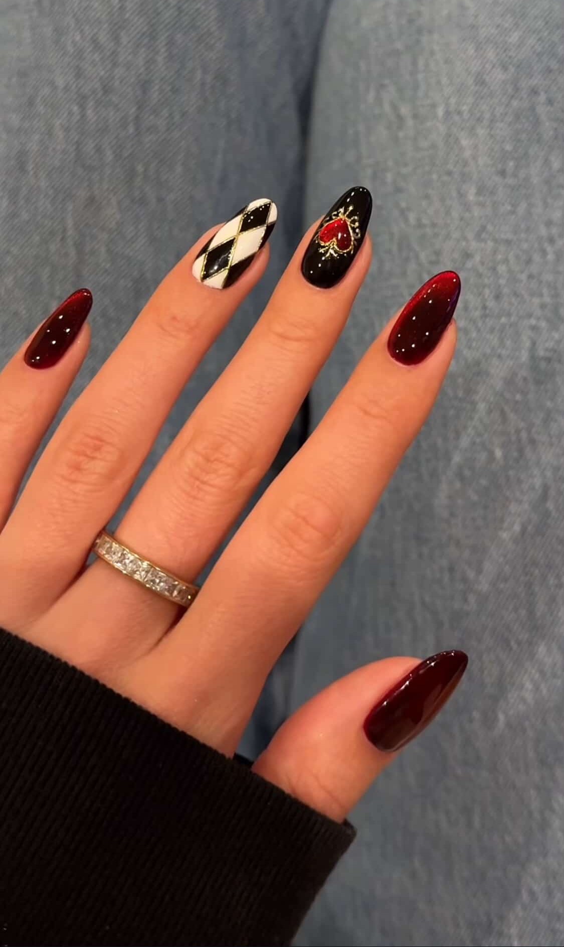 Alternate between glossy black and deep red nails. Or try a black base with red accents—think lightning bolts, tiny heart, geometric patterns, or even tiny red flames.