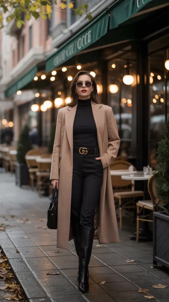 A tailored Camel or cream wool coat is non-negotiable.