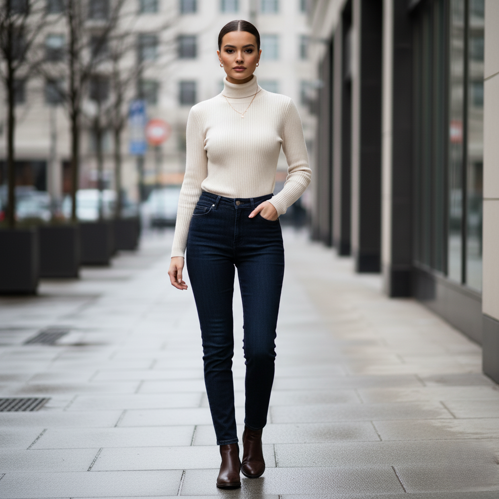 Tuesday? Same turtleneck tucked into dark denim with Chelsea boots.